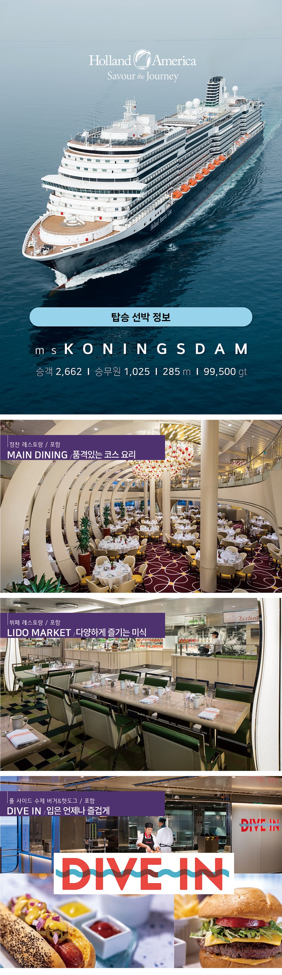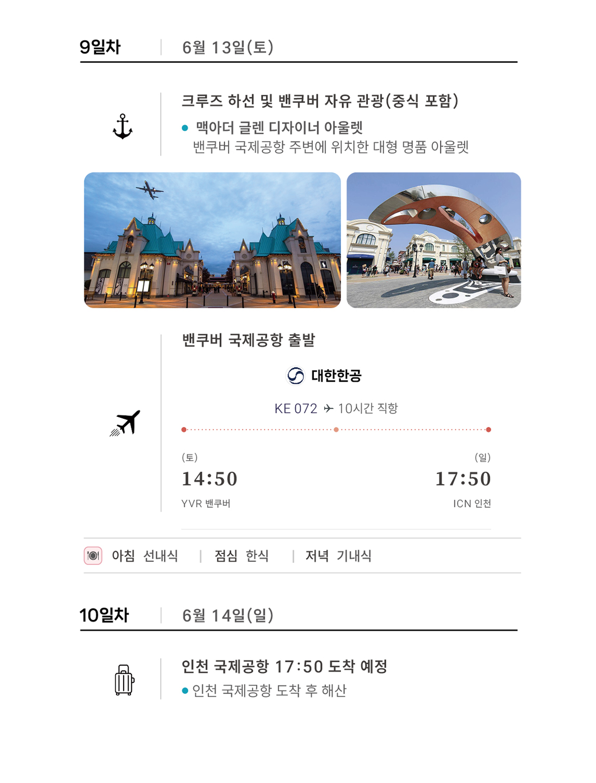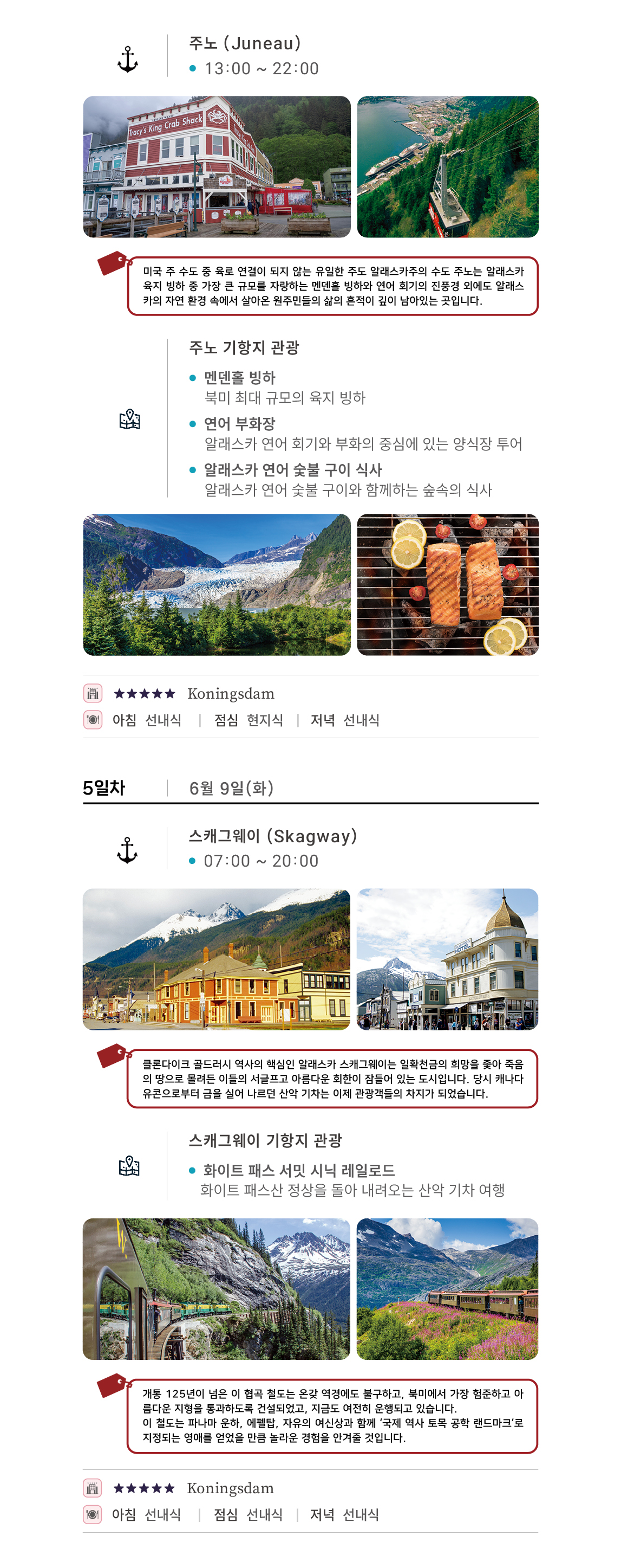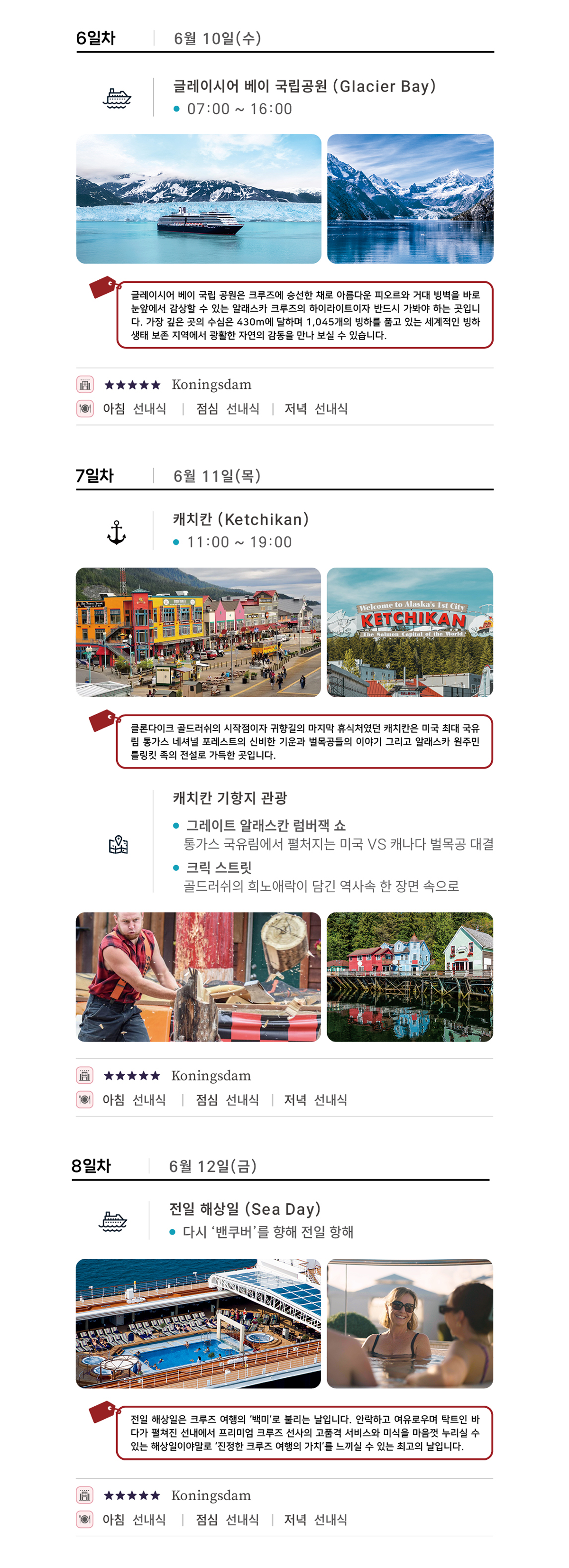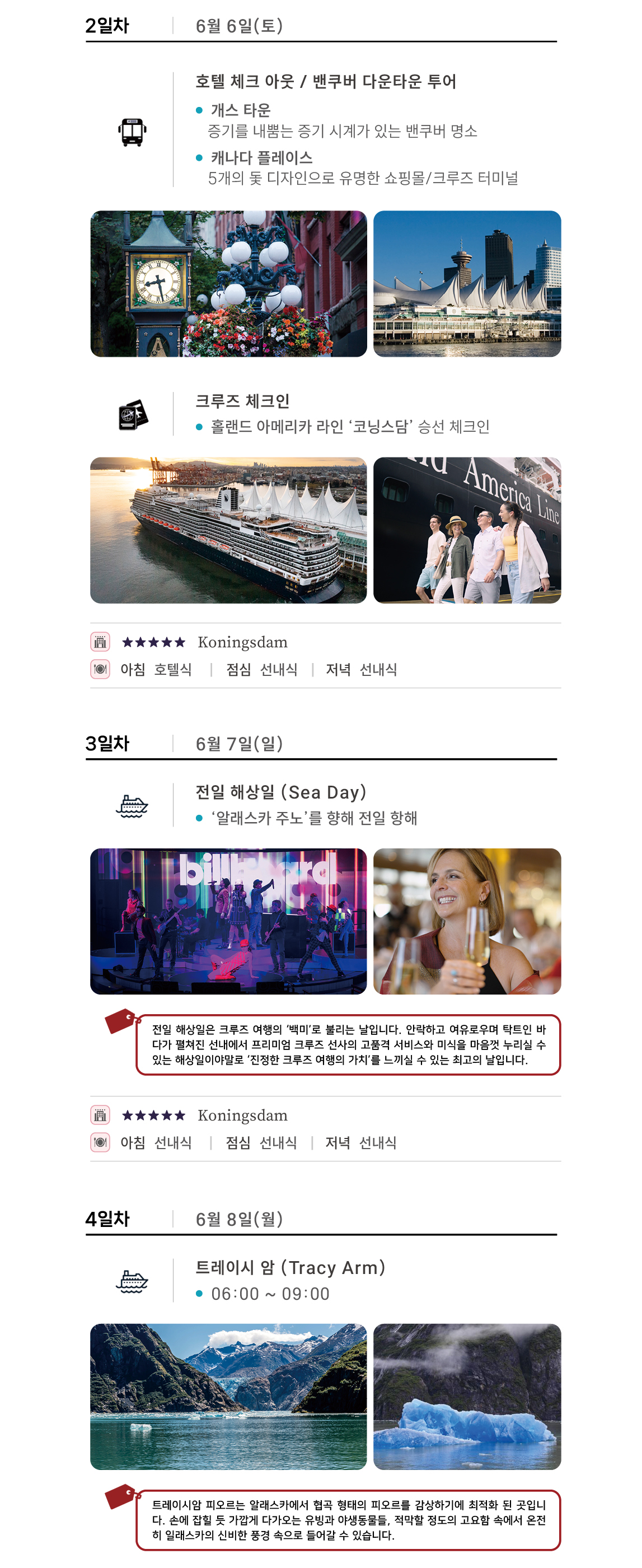 일정표상의 식사 - 크루즈 선내 식사(뷔페/정찬/스넥), 밴쿠버 현지 3식, 주노 기항지 관광 시 1식