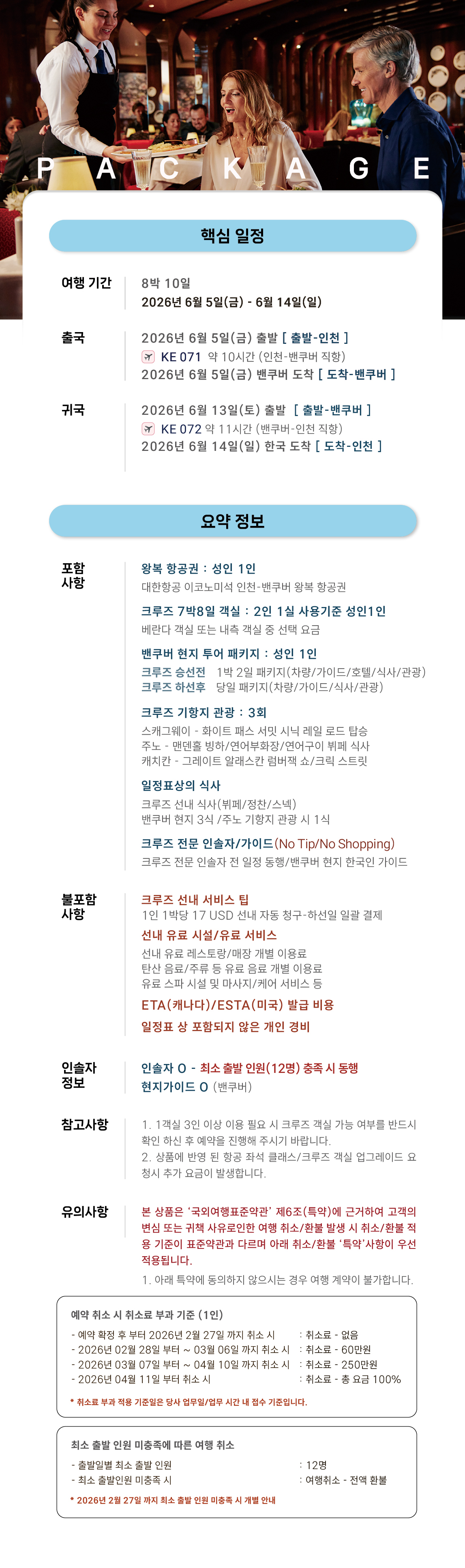 - 크루즈 및 항공권 요금에 포함된 유류할증료는 국제 유가 및 항공사 정책에 따라 변동될 수 있습니다.